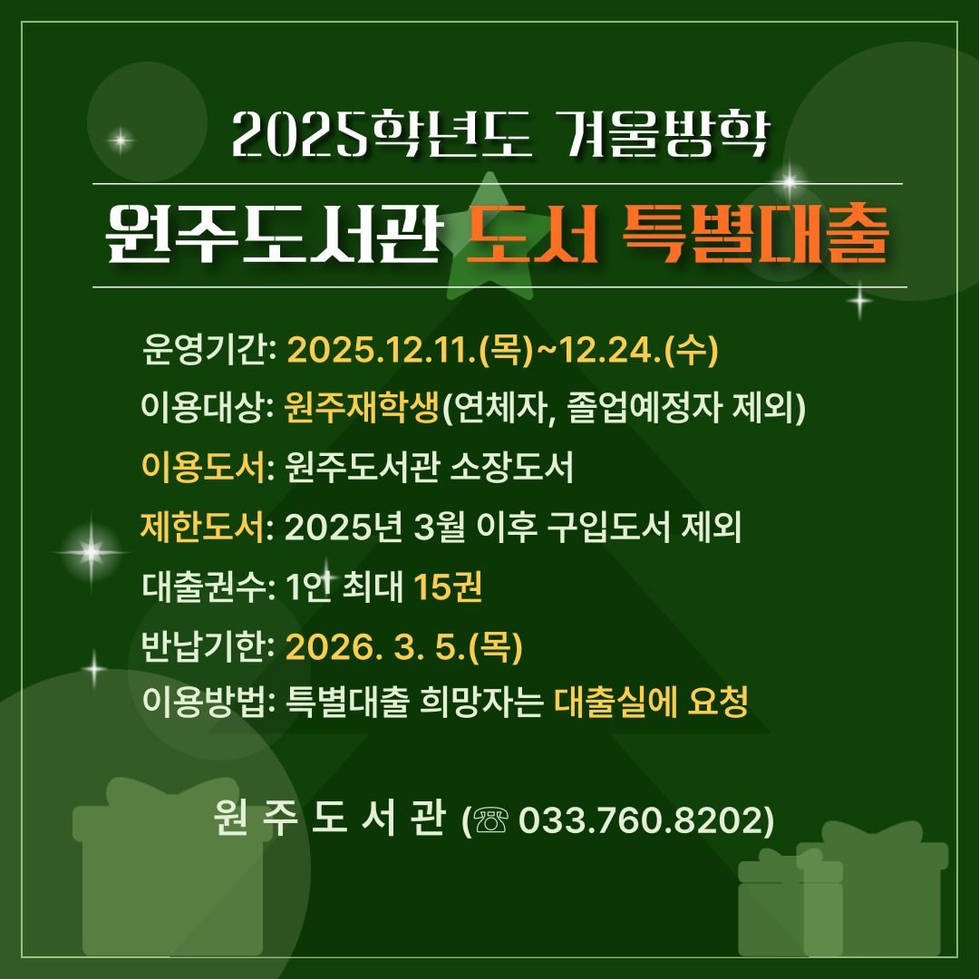 [도서관] 2025학년도 원주도서관 「동계방학 도서 특별대출」