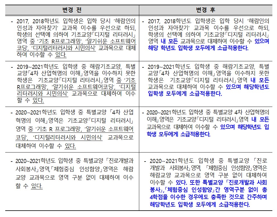 2025학년도 적용 교양 교육과정 경과조치 개선사항 안내