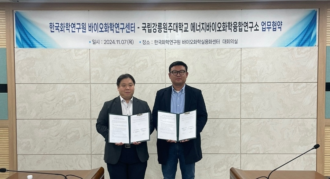 우리대학 에너지・바이오화학융합연구소(소장 강명종)는 지난 11월 7일과 8일 양일간 정부출연연구기관인 한국화학연구원 바이오화학연구센터 (센터장 차현길)과 공동 기술 개발 및 인력 교류를 포함한 업무협약을 체결하였다.